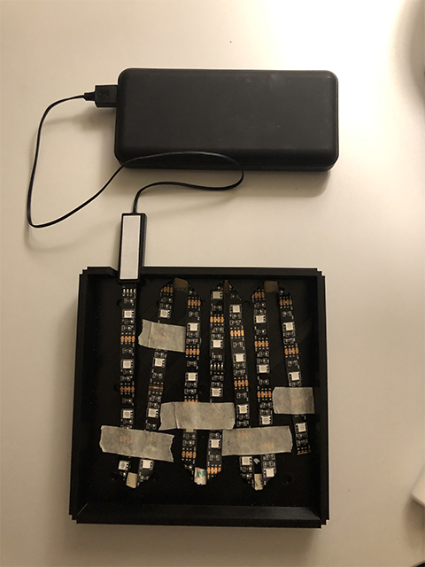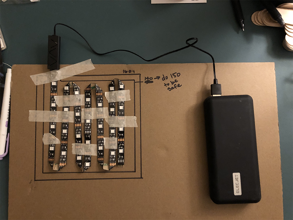I knew I'd need to design around the LED strips at the heart of the box, so I watched tutorials about bending LED strips safely and made a rough prototype with cardboard. One of the core pieces of this box was that it needed to be portable, so I focused A LOT on allowing for a mobile powerbank.