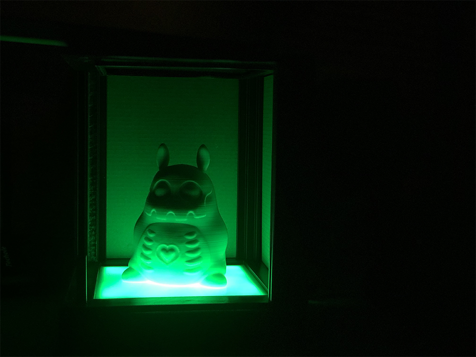 Being able to finally mess around with this box when it was completed was so much fun. I just kept sticking random things into it to see how they would look in different lighting situations. I started with acrylic in the styles I'd originally seen after designing them in Illustrator and Rhino. Then I started sticking random things that I'd 3d printed this quarter into it.