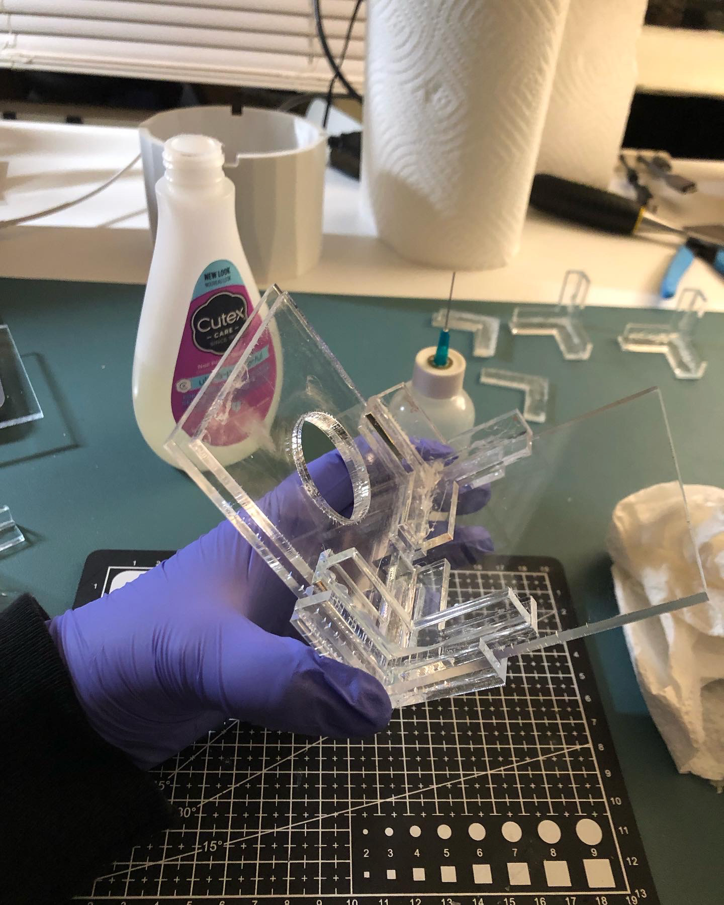 I glued the box together with the adhesive, thankful that I had the right angle supports to figure out how to use the adhesive. I expected it to be closer consistency to caulk, but it was a pure liquid. It had a bit of a learning curve, but I'm glad I learned it before I start my final project.