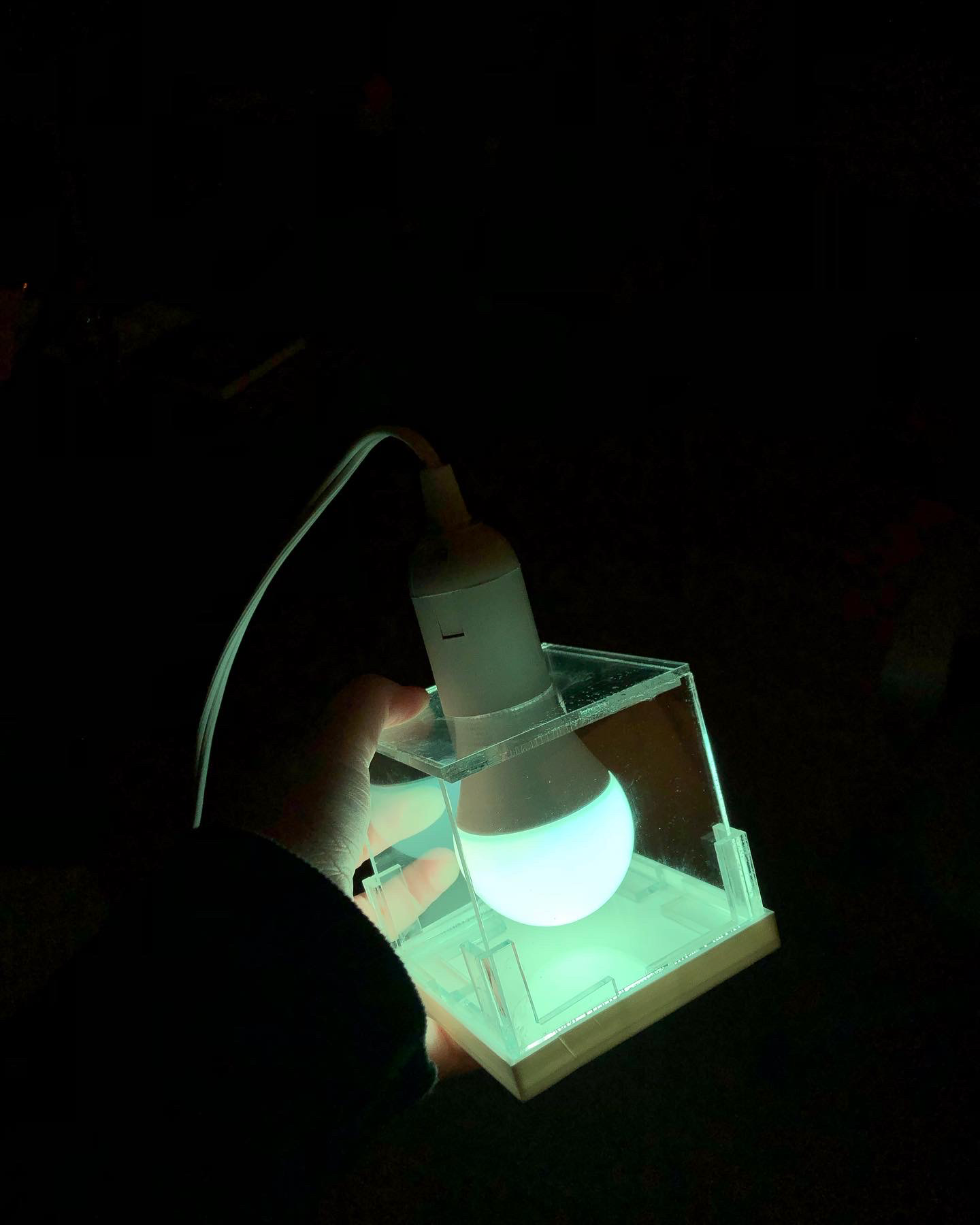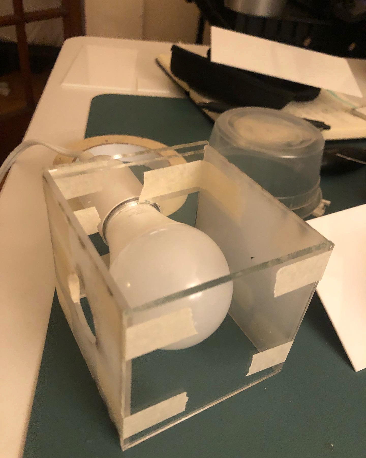 I've been planning on using acrylic for my final project, so I wanted to use this assignment as a chance to test it out. I struggled with tolerance during the CNC assignment, so I focused very intensely on getting the box to have perfect right angles and made them sit flush by having a smaller piece attached to the lightbulb adapter. All of the sides sit tightly against the bottom's spacer plate.