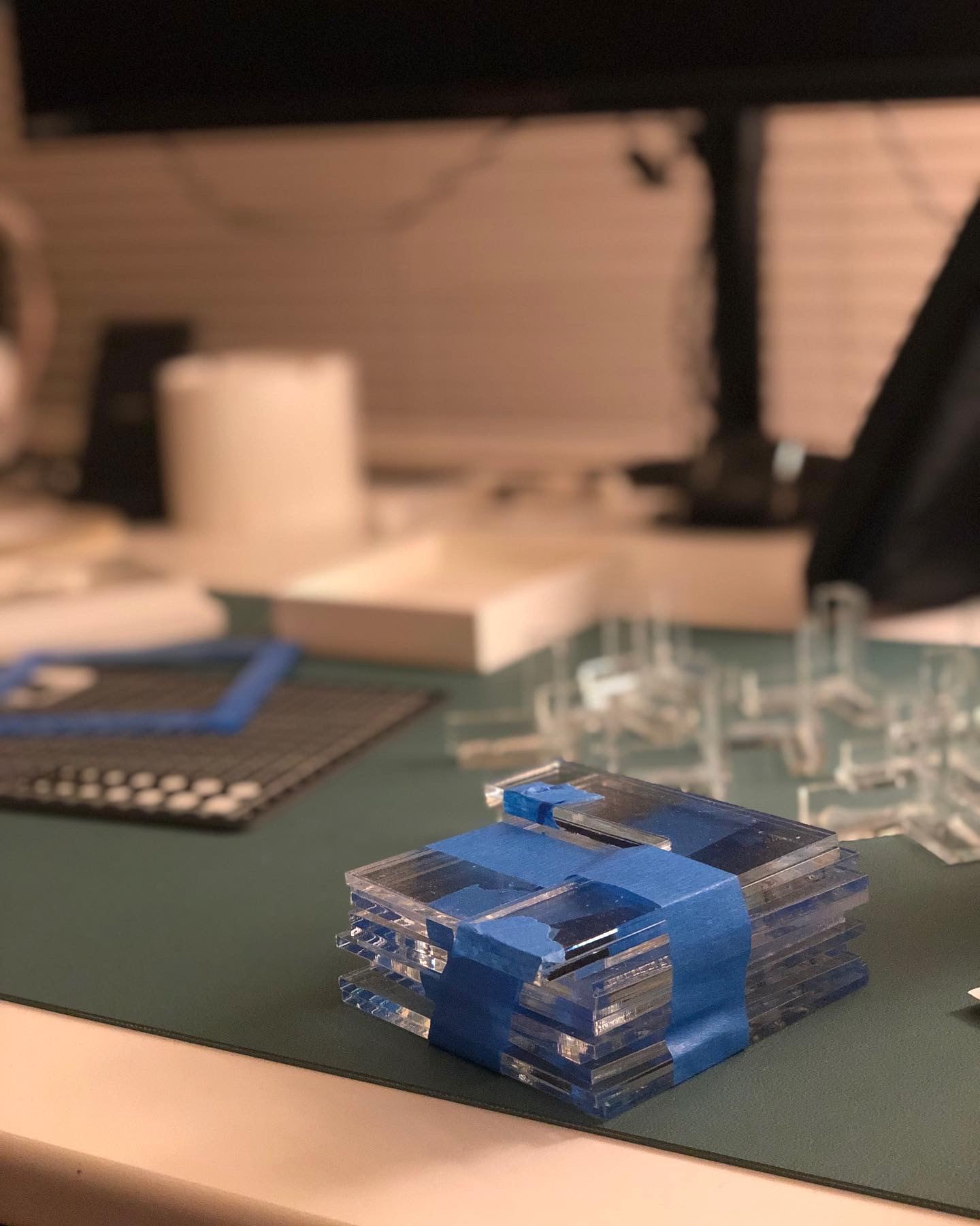 I made a prototype by taping together pieces of acrylic scrap because I didn't want to commit to the plan if I didn't like the potential end result. I ended up loving it and designed the lamp in Rhino for perfect cuts.