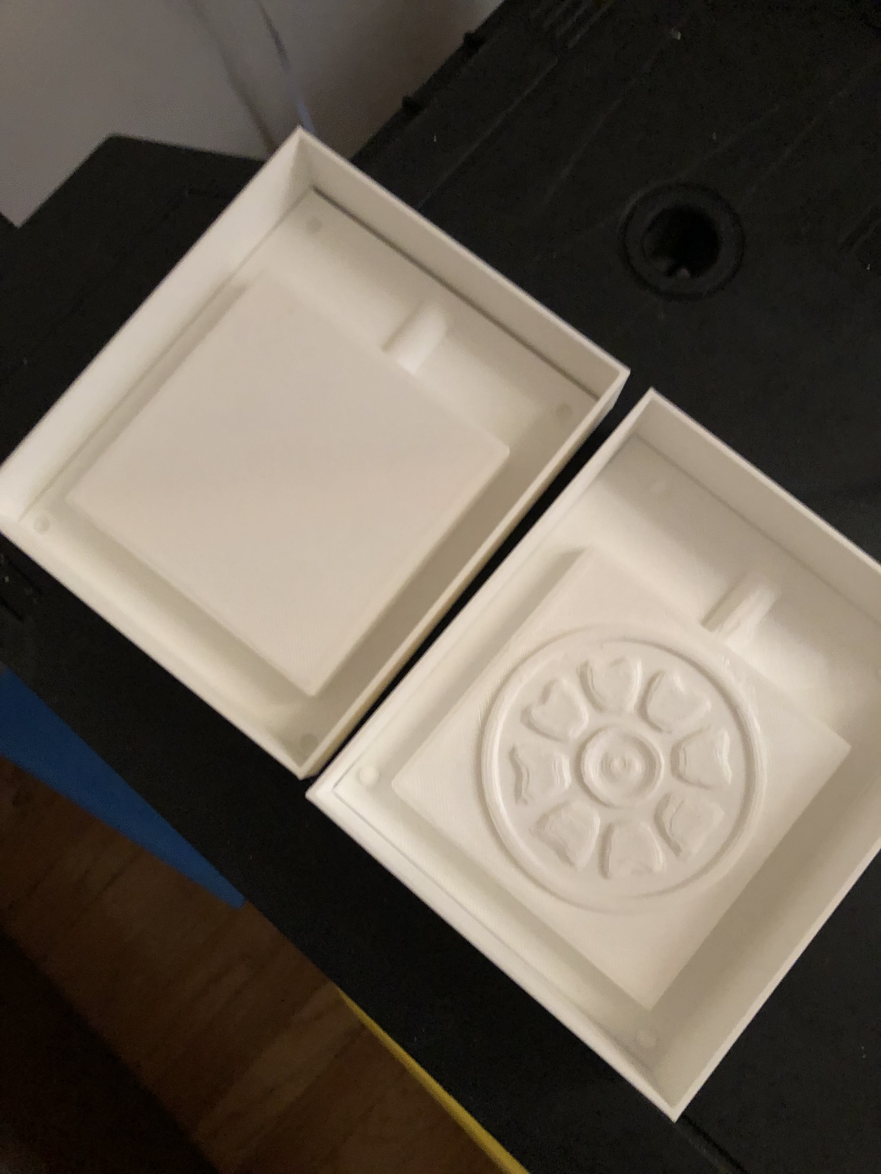 I modeled the mold in Rhino, then printed them overnight. Each side took about 6 hours, and I had to do one reprint. I realized after the first print that the spout didn't extend all the way to the border of the box, so I extended it. Shoutout to Tomomi's design for making me realize it.