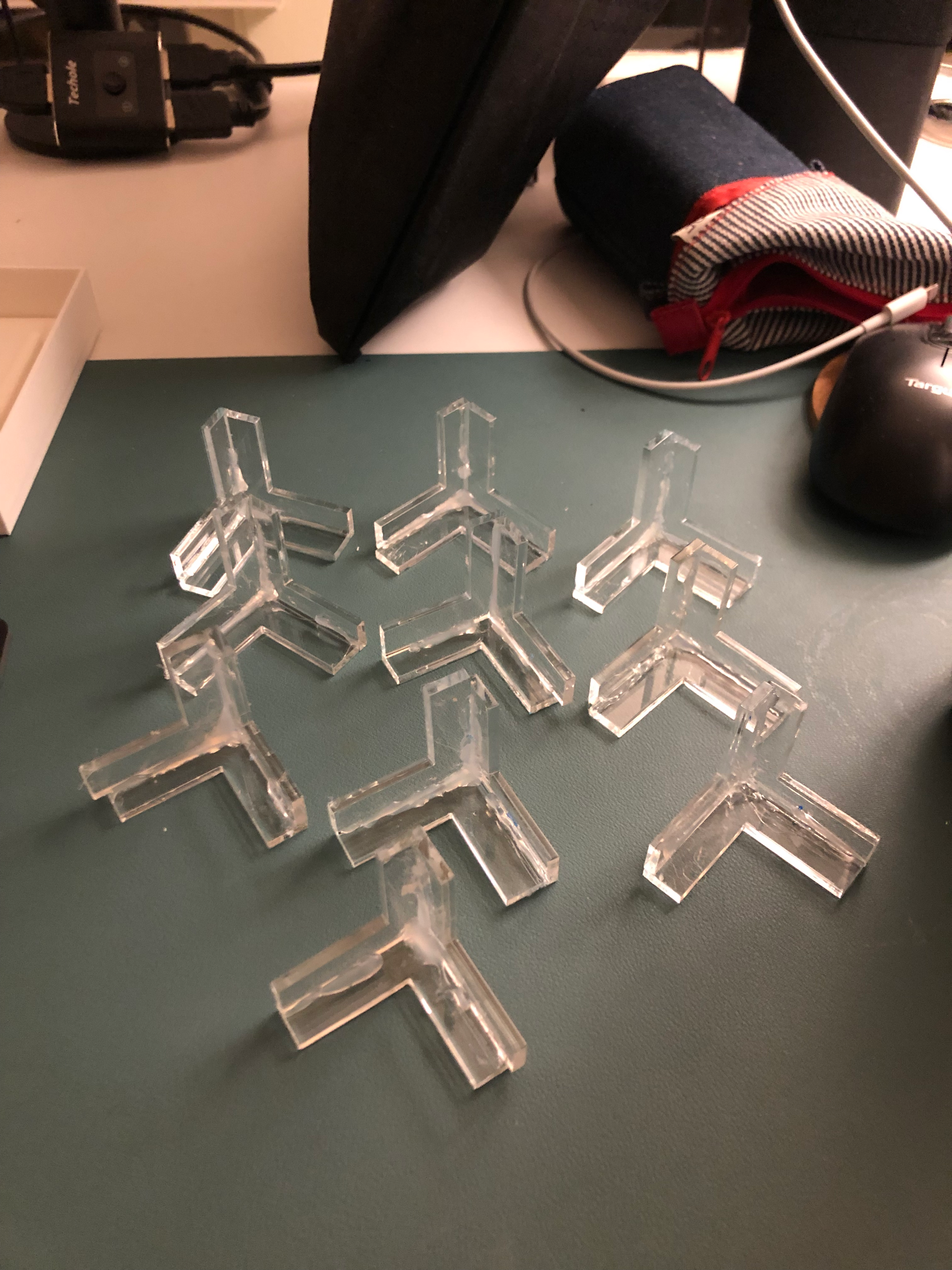 I cut my materials and used the scrap from those cuts to make L's that I glued together to form right angle supports. I used hot glue to assemble them for testing, then cleaned the excess glue off with a chisel. I used acrylic adhesive to bond them for the long term.