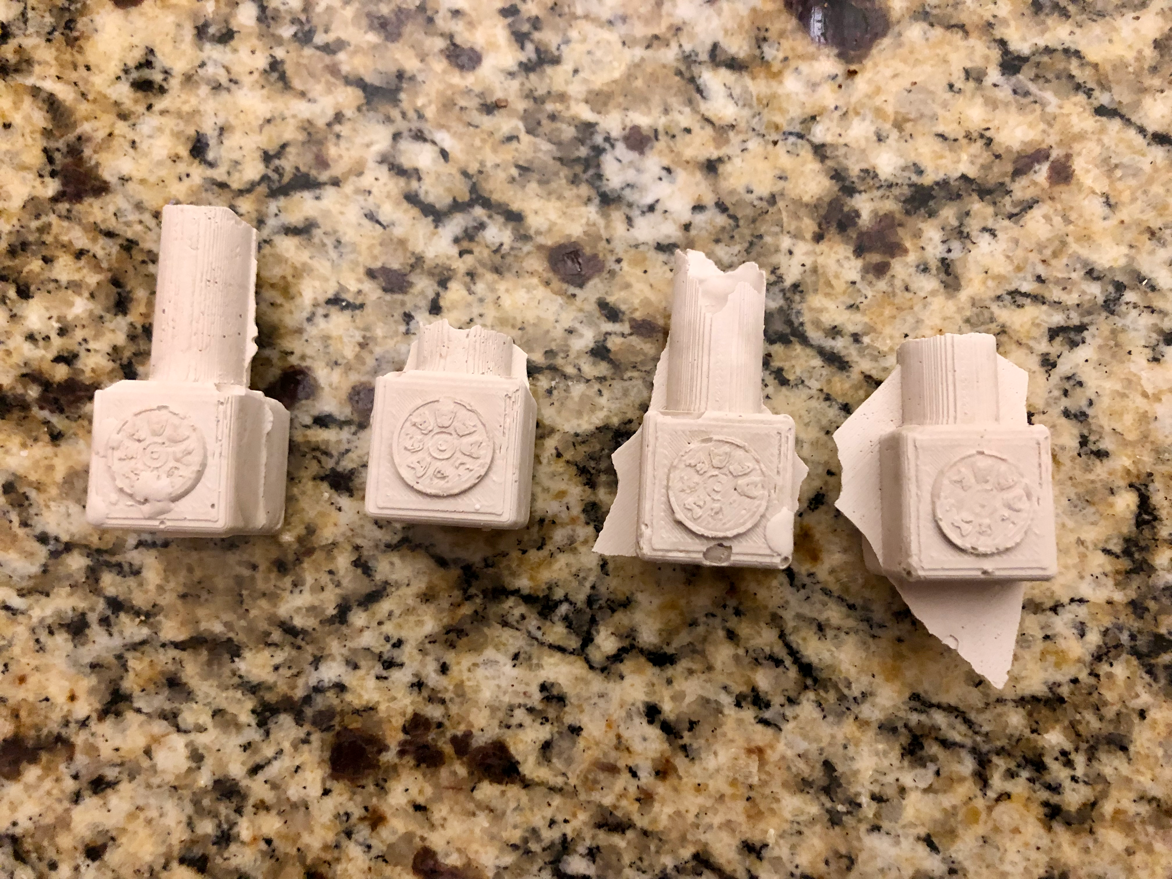 My final cubes are cured and I'm cutting off the excess plaster and painting them to match the Order of the White Lotus' colors. I'll be sanding them with my dad as a fun Thanksgiving activity for two nerds.