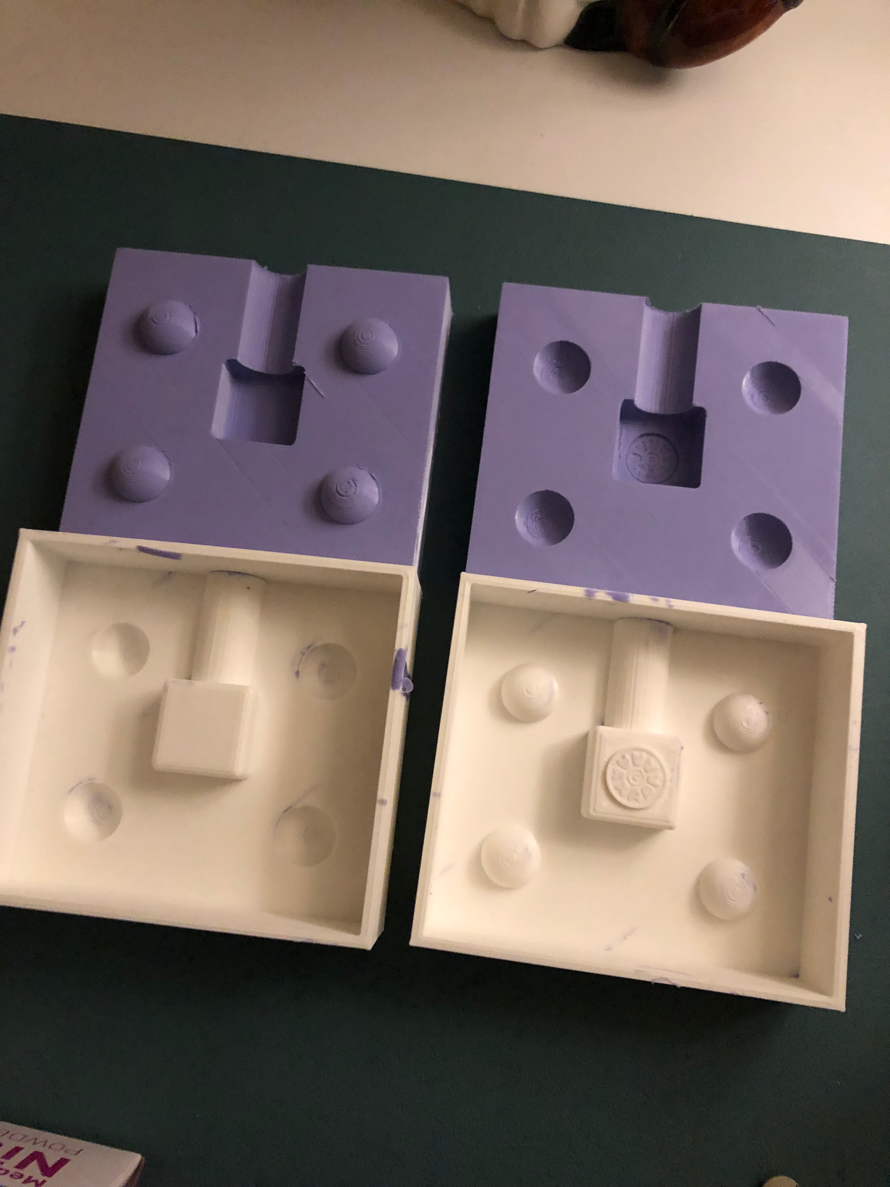I decided to design another mold with larger keys and be extra careful when aligning the two sides. I needed to drastically scale down my cube's size because I didn't have enough Oomoo to pour another full size mold.